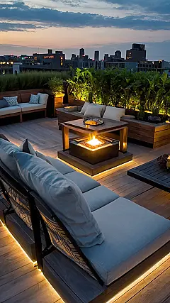 Imagine you’re chilling on a rooftop with your friends, the city lights twinkling in the distance, and a cozy fire pit crackling away. That’s exactly what this awesome rooftop patio design is all about. It’s like a giant, comfy living room in the sky, with built-in seating and enough space to roast marshmallows or just relax and chat. You could even throw a movie night up there – just imagine the popcorn flying!