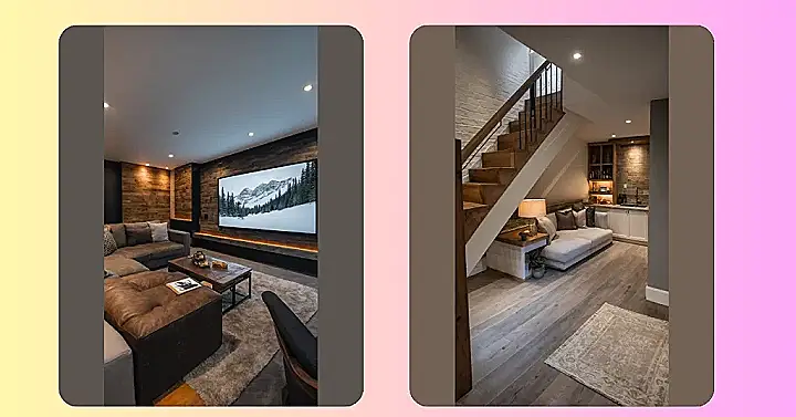 This isn’t just a basement; it’s a mission control center for epic movie marathons and binge-watching sessions. With that massive screen and couches so plush you could probably nap through a horror movie without a single jump scare, you might just forget what sunlight looks like down here. The cool stone wall and those vintage-looking lights on the ceiling beam? They give it an instant vibe check: A+ for peak cozy. Good luck convincing your friends (or yourself) to leave this ultimate chill zone when the snacks are flowing and the Wi-Fi is strong!