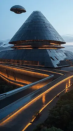 This building looks like something straight out of a sci-fi movie, right? It’s super futuristic! That pointy, cone-shaped roof makes it look like a spaceship, and those sleek lines and smooth curves are definitely out of this world. Imagine waking up in a room with windows that show off amazing views of the planet, and taking the elevator down to a lobby that looks like it was designed by aliens!