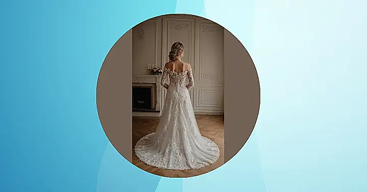 Looking at this wedding dress from the back, you can tell it’s not just any gown; it’s a masterpiece of lace and sparkle! That intricate design on the back and those off-the-shoulder sleeves make it look like something straight out of a royal fairy tale. With all that flowing fabric and a train that probably needs its own zip code, stepping into this would instantly make anyone feel like the star of the show. Just remember to practice your grand entrance walk – tripping is not on the agenda, no matter how majestic the dress is!