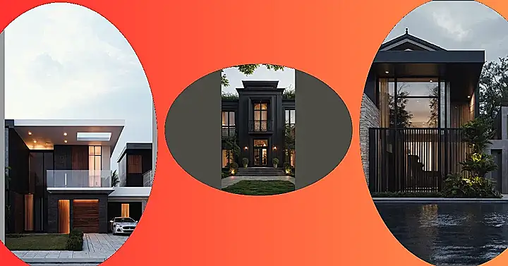 This house is seriously fancy! It’s got all the modern touches, like sleek black and white walls, a super cool garage door, and even a balcony with a glass railing. It looks like a house straight out of a magazine, especially with that fancy car parked in front. It’s basically a dream house, but with a more practical “garage” vibe.