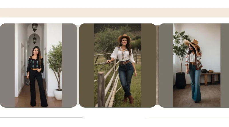 Those perfectly flared jeans are the ideal sidekick to that lively top, adding a touch of classic cool that’s both comfy and super chic. They look ready for anything, from a bustling rancho day to a chill afternoon with your besties, maybe even tackling a mechanical bull! This outfit really nails the blend of ‘I probably just came from a fabulous fiesta’ and ‘Yes, these jeans are definitely approved for kicking back.’ It’s the ultimate proof that you can absolutely mix traditional Mexican rancho style with modern flair and look totally amazing doing it!