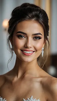 The whole vibe here screams ‘classic bride’ without even trying, mostly because it *is* trying really hard (in the best way!). Those shimmering gold eyelids? They’re so sparkly, you could probably signal planes with them. And that elegant updo, with those soft tendrils framing the face, just ties the whole sophisticated look together. It’s the kind of bridal hair that probably inspired a thousand Pinterest boards, guaranteeing you won’t have a single strand out of place – because nobody wants a rogue hair trying to steal the spotlight on their big day, right? It’s all about looking effortlessly perfect, which usually takes a whole lot of effort!