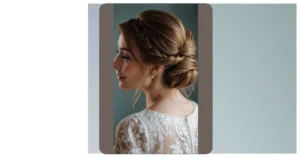 Check out this hair masterpiece! This amazing updo isn’t just a hairstyle; it’s practically a work of art, looking totally ready for a fancy wedding or, you know, just gracefully accepting a bouquet toss. This classic bun in the picture is perfect for looking super elegant without your hair getting in the way when you’re busy laughing at terrible dad jokes during the reception. Plus, it shows off those sparkly earrings and fancy dress details, making you look like a total queen without having to worry if your hair is cooperating.