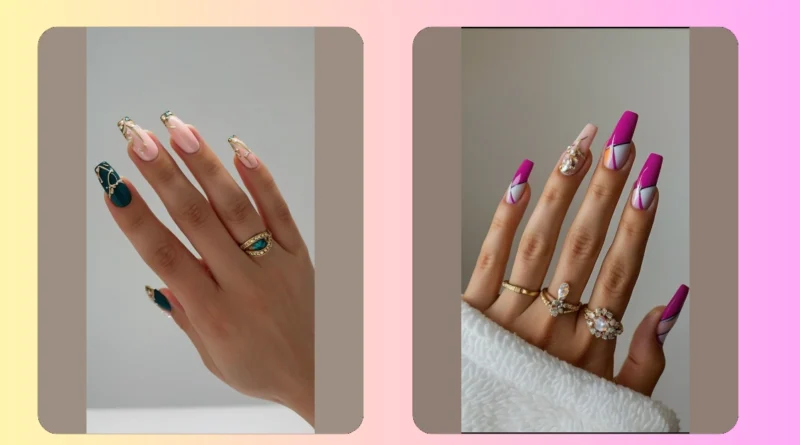 Wow, check out these nails! They’re like a super fancy party on your fingertips. Imagine getting these done for a New Year’s Eve bash in January 2025! That gorgeous mix of sparkly gold and deep green is totally on-trend, and the little jewels add a touch of extra sparkle that’s perfect for celebrating. It’s like wearing tiny works of art on your nails—each one unique and super stylish. They’re definitely not your average January nail art!