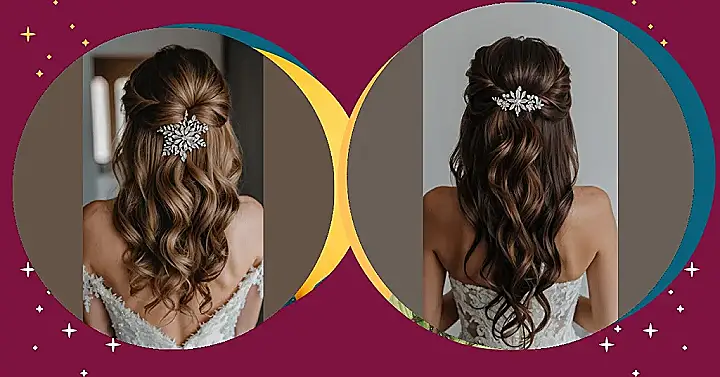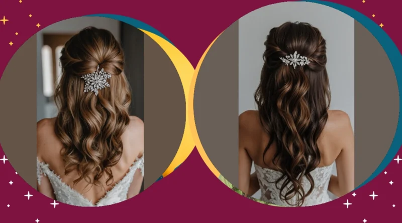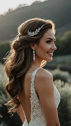 This hairstyle is perfect for a winter wedding! It’s elegant and romantic, with loose curls that flow down the back. The sparkly hair clip adds a touch of glamour, and the style is easy to wear, so you can dance the night away without worrying about your hair. It’s like a winter wonderland for your hair – pretty, effortless, and totally ready for the big day.