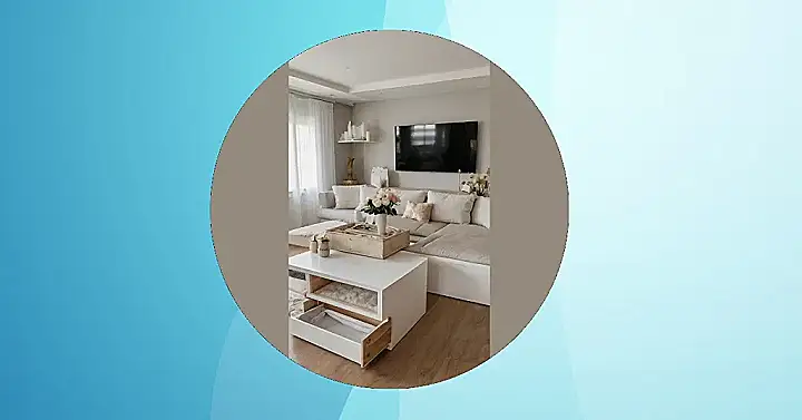 This room looks so comfy, you might accidentally start hibernate. Just imagine sinking into that massive couch after a long day, binging your favorite show on that huge TV. The neutral colours are super relaxing, like a spa day for your eyes! And check out that coffee table – it’s got built-in storage for blankets or maybe even snacks, because let’s be real, snacks are essential for a proper Netflix marathon.