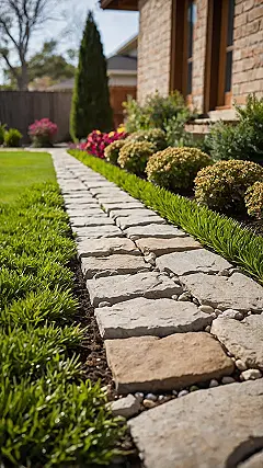 Look at this front yard garden! It’s like the house is rolling out a fancy red carpet, except this one is made of cool, spaced-out stone tiles surrounded by a sea of smooth, round pebbles. It seriously upgrades the whole vibe from just ‘a house’ to ‘a house that knows what’s up’. Walking up this path probably makes you feel a bit important, like you’re about to enter a secret garden, even if you’re just heading inside to grab a snack. The pebbles are like tiny little guards making sure no weeds crash the party, keeping everything looking sharp and welcoming.