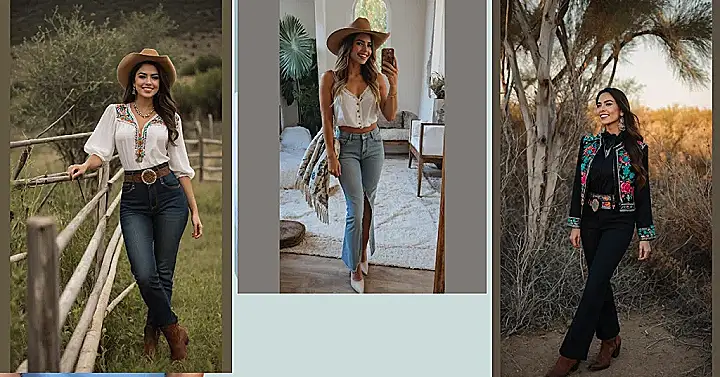 Who says ranch life can’t be super stylish? This fantastic outfit totally nails the Mexican rancho vibe, looking absolutely ready for a picturesque day out on the range. With a fabulous cowboy hat, those perfectly fitted jeans, and a beautiful white blouse popping with colorful embroidery, it’s clear you can look amazing even if your main job is just leaning on a fence. She probably makes the horses jealous of her outfit!