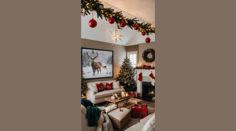 But let’s be real, the true star of this Christmas living room isn’t the sparkling star on the ceiling (though it is pretty cool), it’s that majestic deer on the wall, giving major “I’m watching you, make sure you’re on the nice list” vibes. You just know he’s probably judging your gift-wrapping skills or wondering why he didn’t get an invitation to the holiday feast. And those huge red ornaments hanging from the ceiling garland? They’re so big, you half expect a giant elf to swing by on one like Tarzan. This room really goes all out, making it the kind of place where you could spend all day without even realizing it, probably just eating cookies and pretending you’re waiting for Santa.