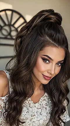 This hairstyle looks like it took hours, but maybe it’s secretly a five-minute miracle you can pull off before the bus arrives? That gorgeous half-up braid is basically a built-in accessory, like a tiny crown saying, “Yeah, I know I look good.” And those waves? They’re so perfect they practically deserve their own fan club. Getting stunning hairstyles like this just makes you want to pose dramatically, even if you’re just waiting for your turn at the water fountain.