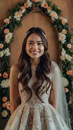 Ever feel like you can’t decide whether to wear your hair up or down? This bride totally gets it! Her half-up, half-down hairstyle is like saying, “I want to look classy, but also, I came here to party!” It’s the perfect compromise for a wedding, prom, or even just feeling extra fancy while binging Netflix. Plus, that sparkly hairpiece is totally stealing the show – talk about adding a touch of awesome!