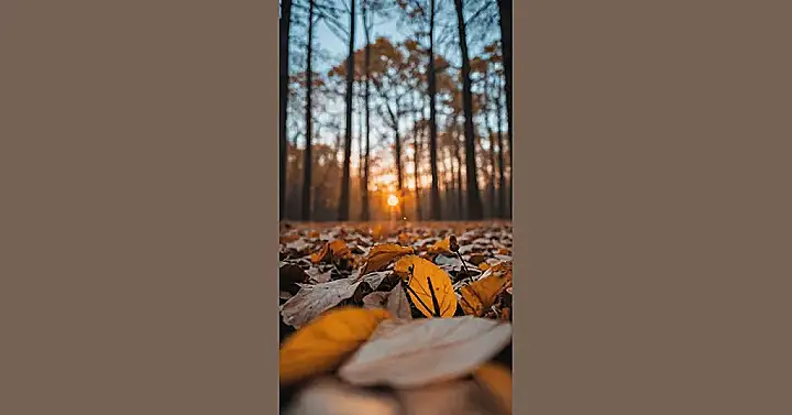 Take a look at this forest floor – it’s absolutely carpeted in gold! It’s like autumn just threw a massive party and these fallen leaves are the colorful confetti left behind. You can practically hear the satisfying crunch under your feet, or maybe that’s just your phone telling you it wants this beauty as its new background. The photo is taken from super low, almost like we’re a tiny squirrel stashing nuts or a very chill leaf just enjoying the view of the glowing sunset. This scene is total ‘nature wallpaper aesthetic’ goals, making even fallen foliage look like a masterpiece.