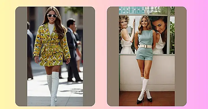 The image shows a woman rocking a super cool sixties outfit! It’s totally groovy, with that super short jumpsuit and a big, white belt to really make her waist pop. And let’s not forget those knee-high socks and black heels – talk about a killer combo! The woman in the image is totally giving off that “I’m ready to take on the world” vibe, and honestly, who wouldn’t feel confident in an outfit this stylish?