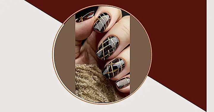Check out these killer plaid nails! They’ve got this super cool dark base, like a mysterious forest at midnight, with hints of reddish-brown peeking through, almost like autumn leaves under the moonlight. Then BAM! Golden lines crisscross over everything, making it look like tiny, treasure-map grids or the fanciest plaid blanket you’ve ever seen. These nails are so shiny and perfectly designed, they probably took more planning than deciding what to binge-watch next.