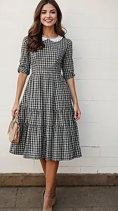 Notice how the straw hat and those chic white heels just elevate the whole ‘Gingham dress’ look from “I’m ready to play hopscotch” to “I’m ready to own the day”? Our friend in the picture clearly knows how to rock this timeless pattern. She’s got that gentle smile and a confident pose, showing that a classic print can be both comfy and seriously stylish. It’s the kind of outfit that probably makes you feel like you’ve got your life together, even if you’re still wondering what you’re having for dinner. Talk about a glow-up with just one dress!