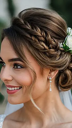 So, picture this: it’s your big day, or maybe your super cool aunt is finally tying the knot, and everyone’s looking for that picture-perfect moment. Your hair, however, has other plans, usually involving frizz or trying to escape! But not with a classic updo like this. We’re talking braids so perfectly woven, it looks like a masterpiece, not a battle. This hairstyle is basically a superhero, keeping everything elegant and in place, so you can focus on saying ‘I do’ without worrying if a rogue strand is photobombing your perfect smile. It’s like magic, but with hairspray!