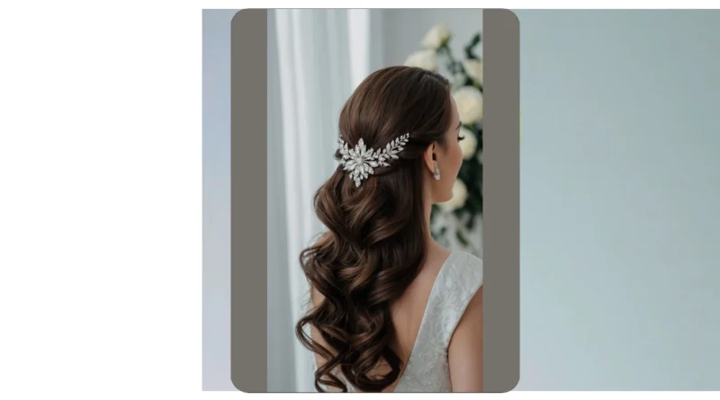 Imagine walking down the aisle on a snowy winter day, looking like a princess in a fairytale! The image shows a gorgeous hairstyle perfect for a winter wedding, with soft, flowing curls and a sparkling hairpiece that’s like a mini-snowflake. It’s all about adding that extra sparkle and glamour to your winter wonderland wedding look, and this hairstyle definitely does the trick!