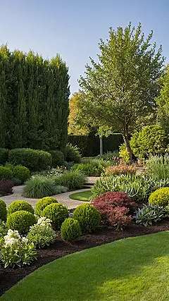 Walking into a garden like this feels less like gardening and more like attending a very exclusive, highly organized plant party. The amount of green is honestly impressive, like someone spilled giant buckets of every shade possible, from the neatly trimmed hedges standing guard along the path, which probably have names like Reginald and Beatrice, to the big leafy trees chilling out in the background. It’s all super tidy and calm, like the green plants got together and decided they were going to be *very* serious about looking good, maybe even a little bit like a perfectly ironed shirt but made of leaves.