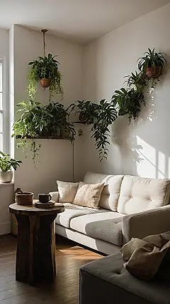 Look at this place! It’s not just a room anymore, it’s like a jungle decided to move in and pay rent… in oxygen. These room plants are literally hanging out on the walls and ceilings, probably plotting how to steal more sunbeams. They’ve clearly formed a committee and decided the best spot for a meeting is directly over the comfy couch. You half expect one to drop down and offer you a leaf-five for joining their green gang.