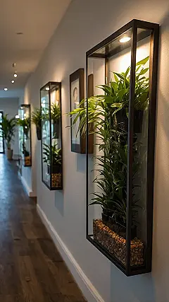 Check out walls like the ones in this picture! These aren’t just plants hanging out on a shelf; they’re practically living art installations. Sticking them in cool glass cases lit up on the wall? That’s next-level plant dedication! It’s like giving your leafy pals their own fancy little apartment with a view (of your house). They’re probably up there judging your life choices, but hey, at least they make the hallway look awesome while they do it. Who needs boring paintings when you can have actual growing things showing off?