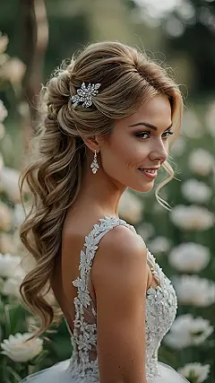 So, picture this: it’s your big day, the sun’s blazing, and you’re trying to look like a princess, not a melting ice cream cone. This hairstyle’s got you covered! It’s like a perfect mix of fancy and chill, with the hair pulled back enough to keep you from sticking to your own face, but with enough curls to make you feel like you’re starring in a rom-com. Plus, that sparkly clip? Total boss move.