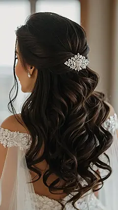Isn’t this hair just, like, the perfect combo of chill and chic? It’s half up, so you’re not drowning in hair all day, but those gorgeous curls flowing down your back? Total bridal goals! It’s like the hairstyle is saying, “Yeah, I’m getting married, but I’m also super comfy and ready for cake.” And that blingy accessory? Chef’s kiss! Time to shine bright like a diamond, or at least a really sparkly hair clip.