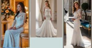 This hairstyle is basically the best of both worlds, making it super popular for anyone walking down the aisle. You get to show off all those amazing long waves, just like the ones in the picture, but half of it is elegantly pulled back. This means no rogue strands flying into your lip gloss when you’re laughing or trying to eat cake – a real game-changer! It’s practical enough to keep you comfy and chic, whether you’re taking photos or tearing up the dance floor later without worrying about a hair disaster.
