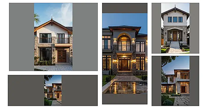 This house is rocking the “traditional” look like it’s starring in a period drama! With that stone facade and fancy roof, it’s giving off serious “old-school cool” vibes. The roof even has a little pointy bit on top – it’s like the house is wearing a tiny crown! It’s definitely not your average cookie-cutter McMansion, that’s for sure.