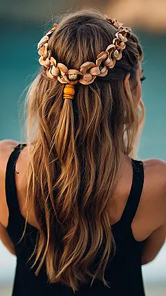 This hairstyle is totally groovy, man! It’s like a modern take on those awesome hippie hairstyles from back in the day, but way more polished. See those braids? They’re not your grandma’s braids; they’re intricate and stylish, kind of like a secret code only cool people understand. It’s the perfect blend of relaxed beach waves and carefully crafted braids—a total vibe. You could totally rock this look at a festival, a summer party, or even just hanging out with your friends.