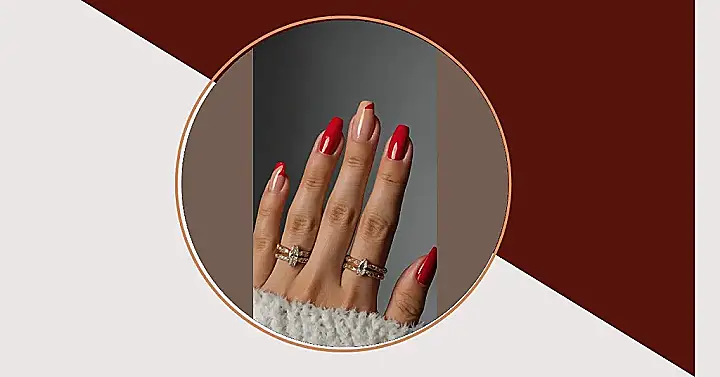 But wait, there’s more! Look closely at that ring finger – it’s rocking a super cool diagonal design, mixing that classic red with a subtle nude. It’s like your nails are saying, “I’m festive, but I’m also fashion-forward and totally unique.” And those sparkly rings? They’re basically tiny, dazzling companions for your fabulous nails, ready to catch the light when you’re dramatically gesturing about how much homework you have. These nails are so on point, they could probably distract from even the most questionable holiday sweater choices.