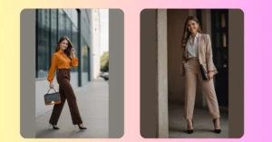 Getting ready for a holiday party can feel like a mission, right? You want to look good, but also not like you tried too hard (even if you totally did). This outfit totally nails that vibe! With the crisp white shirt looking super fresh and those cool orange-brown pants, it’s like she walked straight out of a fashion magazine and into the office holiday potluck. It’s elegant enough for adult-table talk but also looks ready to snag the last mini quiche before anyone else does. Who says holiday fashion has to be all sparkle and no substance? This look proves you can be both chic and ready for anything – especially a buffet.