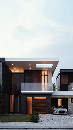 This house is seriously fancy! It’s got all the modern touches, like sleek black and white walls, a super cool garage door, and even a balcony with a glass railing. It looks like a house straight out of a magazine, especially with that fancy car parked in front. It’s basically a dream house, but with a more practical “garage” vibe.