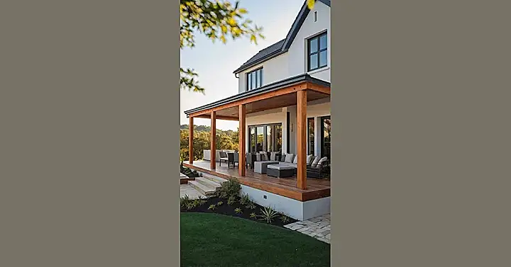 Peep that cool balcony upstairs – perfect for dramatic entrances (or just staring at your phone in peace). And those massive windows? They’re like giant screens for observing the world from your own private kingdom, without anyone asking ‘What are you doing?’ every five minutes. Plus, with a lush lawn like that in front, you’ve got plenty of space for impromptu cartwheels, or just soaking up the sun without bumping into anyone. It’s your own slice of personal freedom, ready for all your awesome, no-judgment adventures.