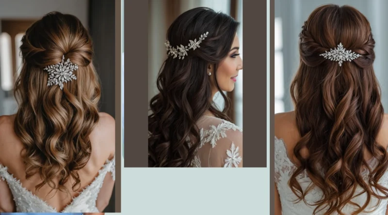 This hairstyle is perfect for a winter wedding! It’s elegant and romantic, with loose curls that flow down the back. The sparkly hair clip adds a touch of glamour, and the style is easy to wear, so you can dance the night away without worrying about your hair. It’s like a winter wonderland for your hair – pretty, effortless, and totally ready for the big day.