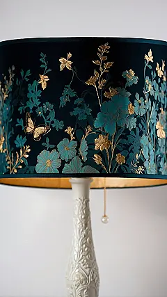 You know how sometimes a lampshade is just… there? Well, this isn’t one of those. This gorgeous decorative lampshade is rocking a super dark, lush blue-green background, like a fancy night sky, covered in shimmering gold and bright teal flowers. And check out that little golden butterfly chilling out, probably thinking it’s found the world’s most luxurious garden! This isn’t just for blocking glare; it’s practically a glowing piece of art for your room, making even your messy desk look a little more chic and totally ready for its close-up.