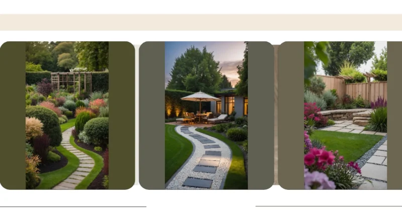 Forget those boring old lawns that just sit there! Check out this outdoor garden design that’s basically screaming, “Come chill here!” With a lawn so perfectly green, you almost expect a golf tournament to break out. But wait, there’s more than just grass! A super cool winding path invites you to explore, bordered by all sorts of bushy characters – some green, some looking fiery red, and even some fancy white-flowering trees showing off. It’s like nature decided to put on its best outfit for a party, and you’re invited to walk through it.