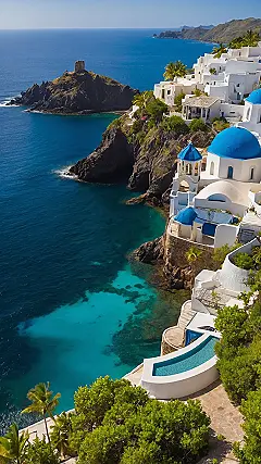 Looking closer, you can almost hear the gentle waves crashing against the cliffs where those charming white houses are stacked like perfectly iced cakes. And peek down near the bottom – there’s a curved swimming pool that looks like it’s just spilling right into the sea! Imagine doing a cannonball there; it’d feel like you’re swimming straight into a giant blue painting. Oh, and see that cool old tower on its own rocky island? It’s probably just chilling, enjoying the best view on the whole island, maybe even planning its next photoshoot. This place definitely proves why ‘beautiful islands photography’ makes for such scroll-stopping content.