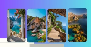 Check out those insane shades of blue! It’s like the ocean decided to put on a gradient show just for us, from shallow, see-through aqua near the rocks to that super deep, mysterious sapphire further out. And framed by those leafy green trees and jagged cliffs, it’s pretty much a postcard come to life. You can almost feel the warm breeze and hear the waves crashing – and probably imagine trying to get a perfect selfie without dropping your phone into the sparkling water below. Talk about a photo that makes you instantly happier than finding an extra fry at the bottom of the bag!