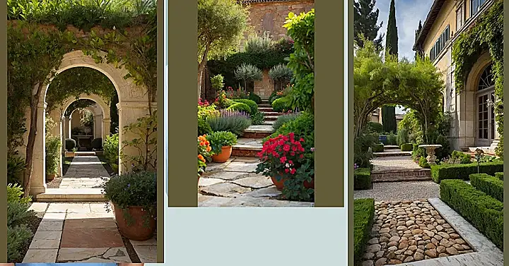 This isn’t your average backyard! Imagine strolling through this Italian garden, feeling like you’re in a movie. There are perfectly trimmed bushes that look like green bricks and paths made of pebbles, leading you on a fancy adventure. You could totally picture someone with a cool hat and sunglasses dramatically walking through here, probably on their way to solve a mystery or find some hidden treasure.
