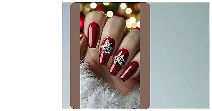 Who needs mistletoe when your nails are this captivating? These *xmas nails* are serving up serious holiday cheer with a glittery, deep red polish that shines brighter than a freshly unwrapped candy cane. And peek at those perfect, frosty white snowflakes – they’re so detailed, you might actually convince someone you grew them yourself! Just be careful not to accidentally blind anyone with your fabulousness while reaching for the last gingerbread cookie at the holiday party.