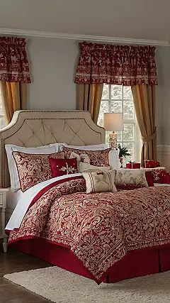 Just peek at those adorable reindeer and snowflake pillows – they’re basically inviting you to snuggle deep into this holiday haven! That rich red comforter, with its cool gold swirly patterns, makes your bed look like it’s wearing its own fabulous Christmas party outfit. Add in the fluffy rug for happy feet and those matching window treatments, and this room isn’t just decorated; it’s a giant, warm, fuzzy Christmas hug. Good luck getting out of bed when it feels this cozy and festive, especially with snow hinting outside the window!