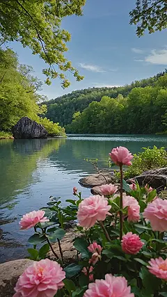 Imagine this: you’re chilling by a peaceful river, the kind where the water’s so still it looks like glass. The sun’s shining, the trees are lush and green, and it’s so quiet you can practically hear your own thoughts—if you had any, that is! Suddenly, a whole bunch of fluffy pink roses pop up, like a nature-themed party just started. They’re practically saying, “Hey! Beautiful tranquil places are even better with a little floral flair!” It’s the kind of scene that would make even your grumpy grandpa smile (maybe).