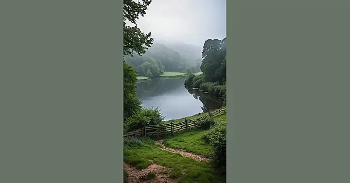 This place looks like it’s straight out of a moody painting, doesn’t it? That lake is all still and a bit mysterious, probably hiding some fish who are just chilling out in the fog. It’s like England decided to pull a blanket of mist over the hills and say, “Surprise!” You can almost feel the damp grass and hear the birds trying to figure out where the sun went. That little track winding through the green grass and past the rickety fence just screams ‘adventure time’ – or maybe ‘time to find a warm cafe’.