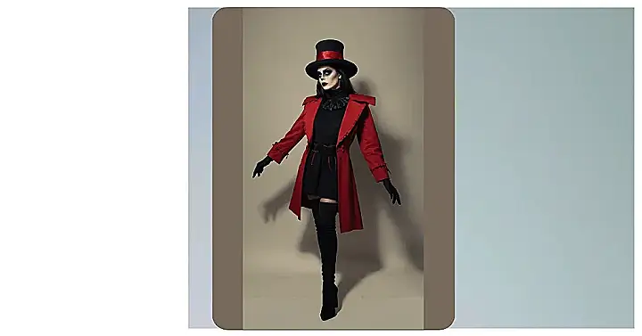 This Halloween costume is perfect for those who love a touch of spooky but don’t have a ton of time to prepare. Just grab a red coat, a black top, and a tall black hat. A little face paint, and boom! You’re ready to cast your spell on everyone at the party. The dramatic makeup and red coat make you look like a mysterious and powerful witch, but the playful hat and black boots add a bit of fun too. You’ll be the talk of the town without having to spend hours putting together an elaborate outfit.