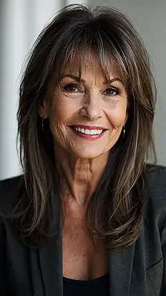 Her hair is like a storybook with a million different chapters. There are long pieces framing her face, short layers for volume, and some subtle highlights that give it a little extra shine. It’s the perfect mix of fun and chic! She looks like she’s ready to take on the world, and that’s what makes this hairstyle so inspiring. You know, it’s proof that you can look amazing at any age, and that’s something worth celebrating!