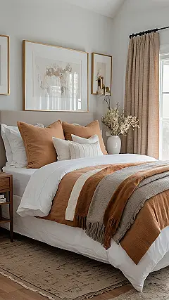 Picture this: a super cozy bedroom where the only drama is deciding which of those fluffy blankets to snuggle under first! This room, with its warm burnt orange pillows and a bed piled high with textured throws, basically screams “Netflix marathon” or “epic nap session.” It’s got that chill vibe that makes you want to cancel all your plans and just hibernate. You might be thinking, “Hey, where are all the romantic rose petals the keyword promised?” Well, maybe they’re saving them for a really, really special occasion… or perhaps they got swept up with the dust bunnies. Who knows!