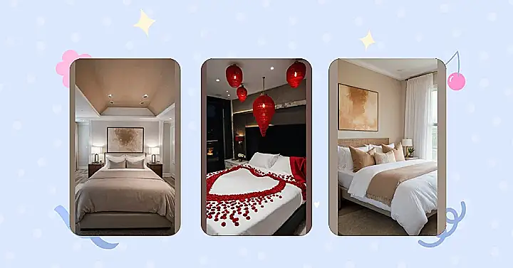 And can we talk about those incredible red lights? They look like fancy, glowing lanterns dropped from the ceiling, adding a super dramatic and cozy feel, especially against those sleek, dark walls. The whole room screams ‘special occasion,’ from the scattered petals to the soft lighting and the little vase of white flowers on the nightstand. It’s the kind of decor that makes you feel like you’ve walked onto a movie set, and the only thing missing is someone shouting, “Action!” Just try not to sneeze and blow all the petals away – that would be an un-romantic disaster!