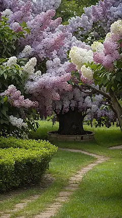Peeking around the corner, you see this cool stone path that looks like it leads right into the heart of the lilac action. It’s like the garden rolled out a rocky red carpet just for you to admire all the purple glory spilling everywhere. With the neat green lawn rolling away and the big trees chilling in the background, this isn’t just a bunch of flowers; it’s a whole scene. It’s the kind of lilac garden landscape that makes you want to grab a lemonade and just hang out, soaking in the floral drama and maybe counting how many different shades of purple are happening at once.