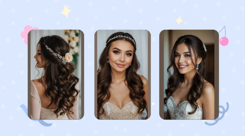 Woah, check out this hair! It’s giving off major “future Mrs.” vibes, and honestly, we’re obsessed. This isn’t just a hairstyle; it’s a masterpiece that says, “I’m ready for my close-up!” We love how it’s half-up, half-down with those gorgeous waves, giving you the best of both worlds – elegant for all the fancy photos, but still super fun and flowy. And that sparkly headband? It’s basically a crown, making sure everyone knows you’re the star of the show, dazzling brighter than any disco ball.